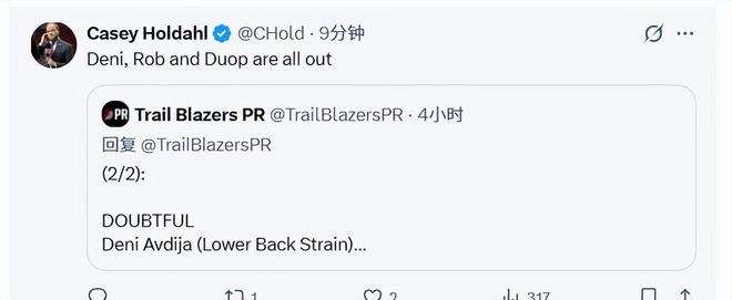 北京时间1月24日,开拓者对阵猛龙,赛前,开拓者官方更新伤病报告,阿夫迪亚、里斯和罗威都将缺席本场比赛。早先,阿夫迪亚被列为小概率出战,里斯和罗威被列为出战成疑,如今三人都将不会参加今天这场比赛。